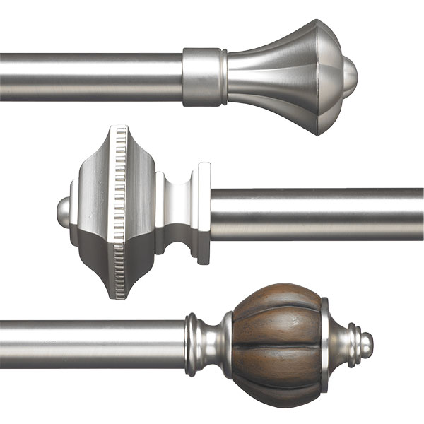 Adjustable 1" diameter single and double rod sets featuring authentic materials, available in 8 finial styles and 4 finishes.