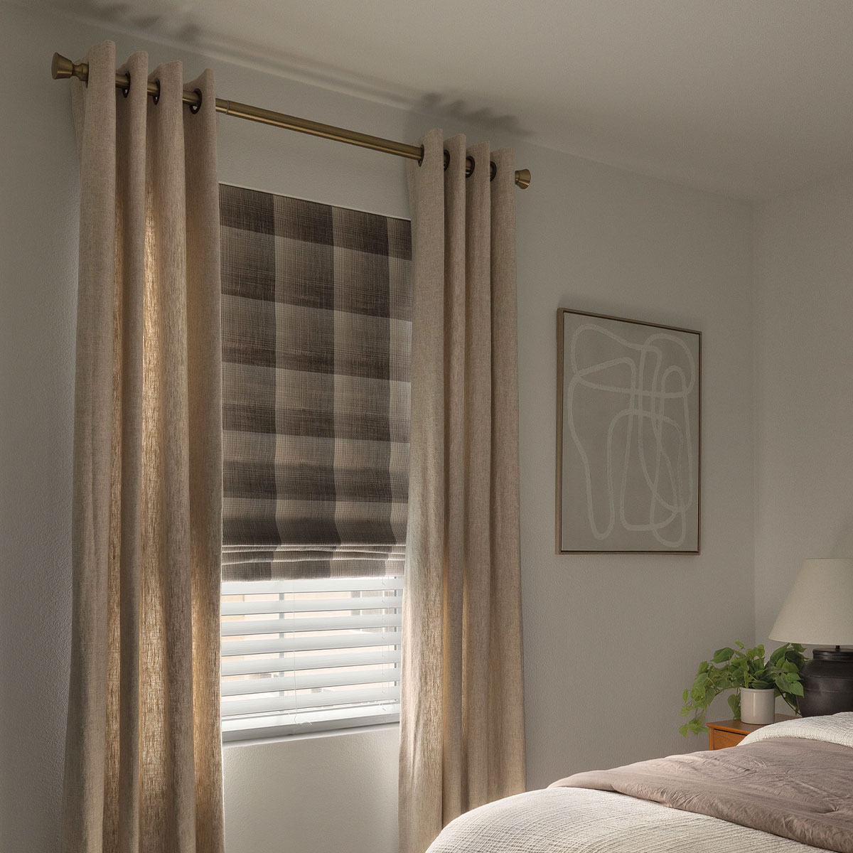 - Flat Roman Shade in Torrington Saddle layered under Grommet Heading EZ Panels in Agora Flax with Kirsch Hardware Designer Metals Collection